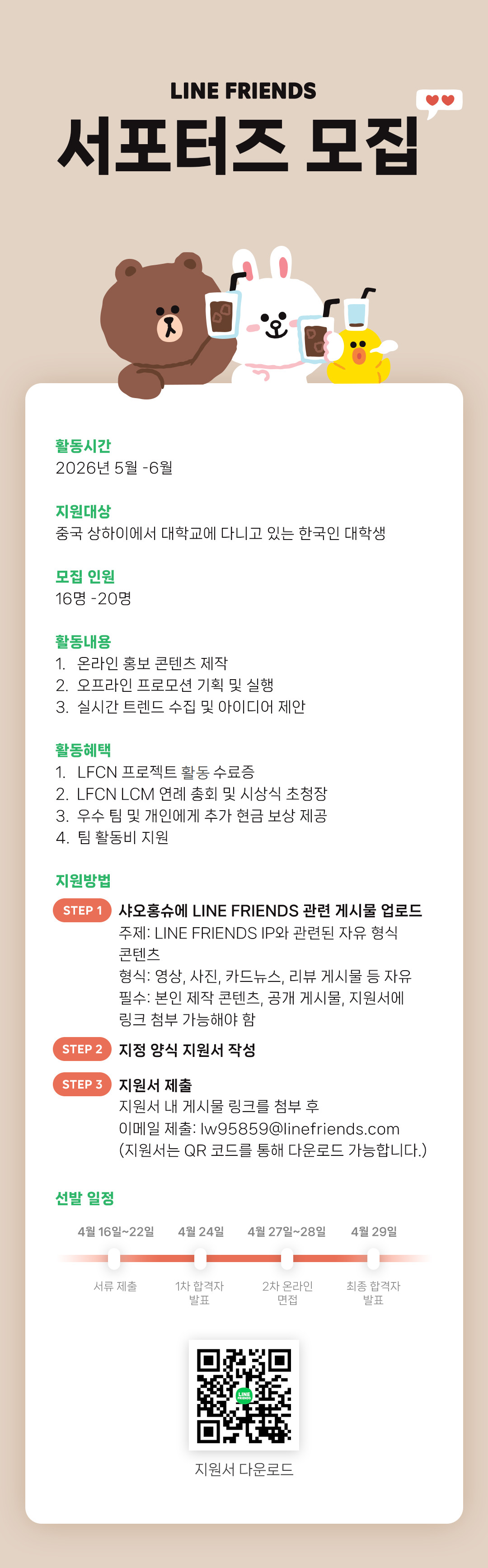 LINE FRIENDS 글로벌 서포터즈 모집 안내💚 LINE FRIENDS와 함께 콘텐츠를 만들고, IP 마케팅을 경험할 수 있는 서포터즈를 모집합니다✨🐻🐰 📍활동 기간 2026년 5월 ~ 6월 (약 2개월) 📍지원 대상 중국 상하이 소재 대학에 재학 중인 한국인 대학생 📍모집 인원 16명 ~ 20명 📝 활동 내용 • LINE FRIENDS K-POP IP 기반 SNS 콘텐츠 제작 • 오프라인 프로모션 기획 및 실행 참여 • 현지 트렌드 리서치 및 마케팅 아이디어 제안 ✅ 활동 혜택 • LFCN 프로젝트 수료증 발급 • LFCN LCM 연례 총회 및 시상식 초청 • 우수 팀 및 개인 대상 추가 인센티브 제공 • 팀별 활동비 지원 1️⃣ 지원 방법 ① 샤오홍슈에 LINE FRIENDS 관련 콘텐츠 업로드 ② 지정 양식 지원서 작성 ③ 게시물 링크 첨부 후 이메일 제출 ⚠️ 시스템 문제로 이메일 주소가 변경되었습니다. 번거로우시겠지만 아래 이메일로 지원서를 첨부하여 보내주시면 감사하겠습니다! 📬: lw95888@linefriends.com 2️⃣ 지원서 작성 유의사항 • 지원서는 QR코드를 통해 다운로드 가능합니다 • 본 모집은 콘텐츠 업로드 → 지원서 제출 순으로 진행됩니다 • 지원서에는 업로드한 게시물 관련 문항이 포함됩니다 • 한국어 및 중국어 모두 작성 필수 • 개인 지원만 가능 (팀 지원 불가) 3️⃣ 게시물 업로드 가이드 • 주제: LINE FRIENDS IP 관련 자유 콘텐츠 • 형식: 영상 / 사진 / 카드뉴스 / 리뷰 등 자유 • 필수: 본인 제작 콘텐츠 / 공개 게시물 📍 우대 사항 • SNS 채널을 활발히 운영 중인 분 • 콘텐츠 제작 및 디자인 역량 보유자 • 아이돌 및 K-POP 문화에 대한 이해도가 높은 분 📌 지원 기간 2026년 4월 16일(목) ~ 4월 22일(수) 문의: wechat: dbwls7214
