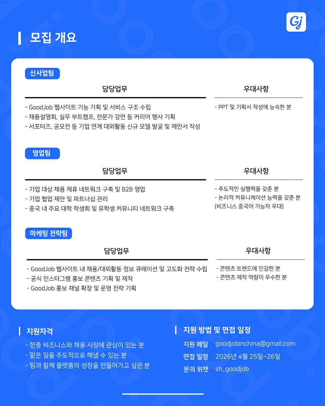 📢 GoodJob 팀원 모집 GoodJob은 중국 내 기업과 한국인 유학생을 연결하는 한중 채용·대외활동 플랫폼입니다. 현재 상하이를 기반으로 북경 및 전 중국 확장을 준비하고 있으며, 함께 성장할 팀원을 모집합니다. 🔹 모집 분야 - 신사업팀 (기획·프로젝트) - 영업팀 (기업 제휴·B2B) - 마케팅 전략팀 (콘텐츠·홍보) 🔹 지원 대상 - 한중 취업·비즈니스에 관심 있는 분 - 직접 실행하며 성장하고 싶은 분 📩 지원 방법 - 이메일: goodjobinchina@gmail.com - 제출 서류: GoodJob_공개채용_이력서 (이메일 제목 및 파일명: 학교_이름) + 포트폴리오(선택) - 서류 제출 마감: 4월 22일(수) 21:00까지 - 오프라인 면접: 4월 25일~26일 (온라인 면접 미지원) - 면접 장소: 복단대학교 (추후 안내) - 문의 WeChat: sh_goodjob 🌐 굿잡 관련 사이트: www.goodjobchina.com 📷 인스타그램: goodjob_china