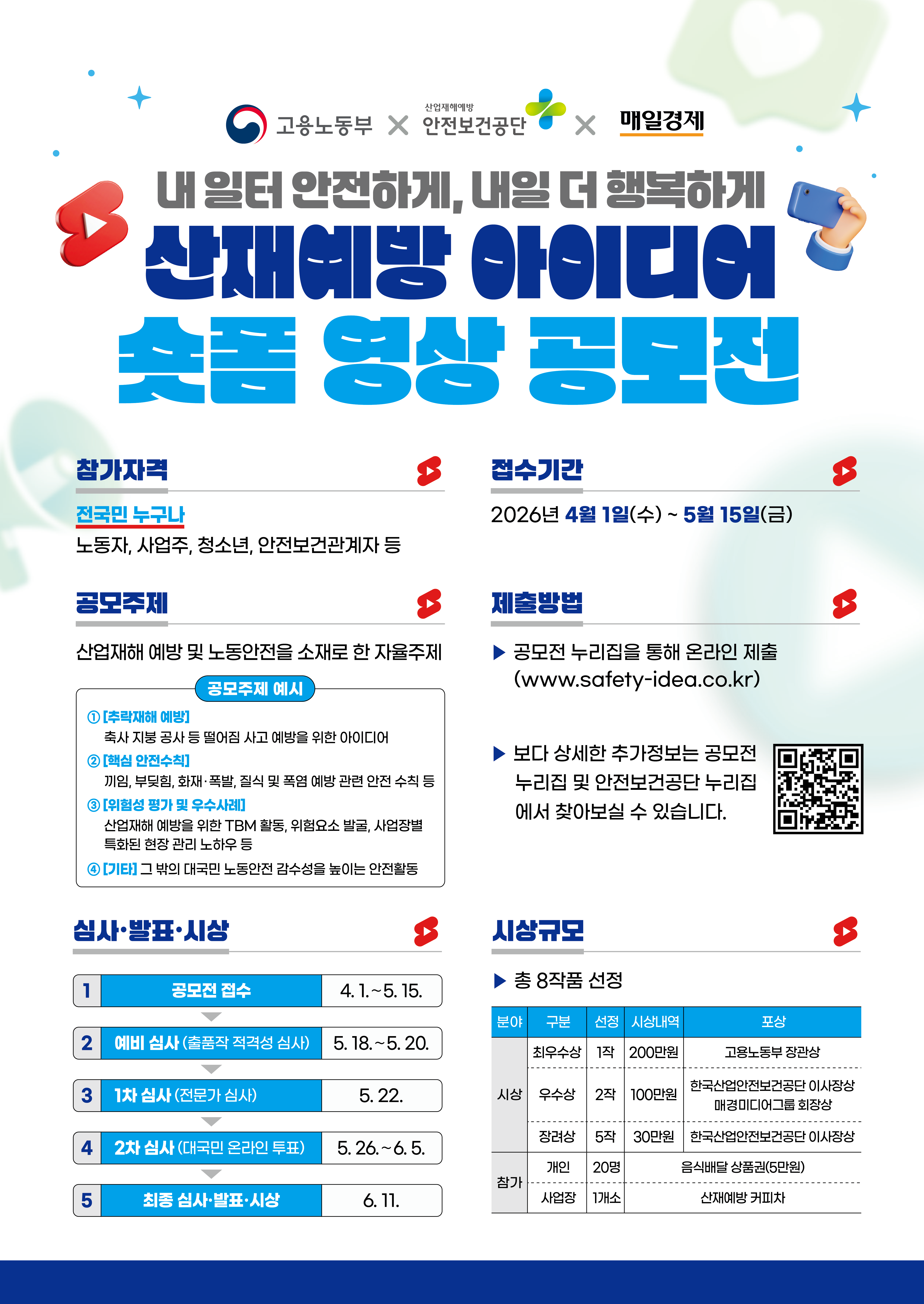 "내 일터 안전하게, 내일 더 행복하게" 산재예방 아이디어 숏폼 영상 공모전 ● 공모 개요 - (공모기간) ’26. 4. 1.(수) 09:00 ~ 5. 15.(금) 18:00 [45일] - (참여대상) 전 국민 누구나 노동자, 사업주, 청소년, 안전보건관계자 등 - (공모주제) 산업재해 예방 및 노동안전을 소재로 한 자율주제 • (예시) ① 추락재해 예방: 축사 지붕 공사 등 떨어짐 사고 예방을 위한 아이디어 ② 핵심 안전수칙: 끼임, 부딪힘, 화재‧폭발, 질식 및 폭염 예방 관련 안전수칙 등 ③ 위험성평가 및 우수사례: 산업재해 예방을 위한 TBM 활동, 위험요소 발굴, 사업장별 특화된 현장 안전관리 노하우 등 ④ 기타: 그 밖의 대국민 노동안전 감수성을 높이는 안전활동 - (공동주최) 고용노동부, 한국산업안전보건공단, ㈜매일경제신문사 ● 공모방법 - 공모전 홈페이지 내 출품 페이지를 통한 온라인 공모 • 공모전 홈페이지 URL : www.safety-idea.co.kr - (제출형식) 숏폼(1분 이내, 세로형(9:16) 권고) - (제출방법) 개인 SNS 등에 업로드 후 게시글 URL 및 원본 영상 제출 ● 심사 및 시상 일정 - (예비심사) ‘26. 5. 18. ~ 5. 20. 출품작 적격성 심사 - (1차 심사) ’26. 5. 22. 전문가 심사 - (2차 심사) ’26. 5. 26. ~ 6. 5. 대국민 온라인 투표 - (최종심사) ’26. 6. 11. 최종 심사ㆍ수상자 발표 및 시상식 진행 ● 시상내역 - 수상부문 : 총 8점 / 550만원 • 최우수상(1점) : 200만원 / 고용노동부 장관상 • 우수상(2점) : 100만원 / 한국산업안전보건공단 이사장상, 매경미디어그룹 회장상 • 장려상(5점) : 30만원 / 한국산업안전보건공단 이사장상 - 참가부문 : 개인 및 사업장 구분 • 참가상(개인, 20명) : 배달의민족 상품권(5만원) / 추첨 • 참가상(사업장, 1개소) : 산재예방 커피차 / 추첨 ● 선정기준 - 주제적합성(30점) : 산업재해 예방 및 노동안전이라는 공모 주제에 부합하는가? - 창의성(20점) : 참신하고 독창적이며, 숏폼 트렌드를 잘 반영하였는가? - 완성도(20점) : 영상의 구성, 기획력, 편집 등 기술적 완성도가 우수한가? - 활용도(30점) : 국민적 공감대를 이끌어내며, 홍보 콘텐츠로 활용 가능한가? ● 유의사항 - (응모 및 작품 제작) • 출품작은 반드시 본인 순수 창작물이어야 하며, 주제를 벗어나거나 규격에 맞지 않는 작품, 표절이나 타 공모전 수상작으로 판명될 경우 심사 대상 제외, 당선 후 확인될 경우 무효화함 • 심사를 통해 당선작이 없다고 판단될 경우 시상하지 않을 수 있으며, 응모 작품의 수준 및 수량에 따라 수상 인원 조정 가능 • 수상자는 상금 및 상장 수여 전까지 작품 활용에 필요한 고화질 원본 파일 제출, 미제출 시 수상 취소될 수 있음 • 영상 제작 시 생성형 AI 기술 활용 가능하나, 활용 여부를 명시해야 하며, AI 활용 적절성은 예비 심사 과정에서 검토됨 • 모바일 시청 환경을 고려하여 주요 자막 및 인물이 화면 상·하단에 가려지지 않도록 ‘쇼츠 데드존(Dead Zone)’ 감안하여 제작 - (저작권 및 지식재산권) • 출품작은 법적 문제가 없어야 함(저작권, 초상권, 지식재산권, 폰트, 음원 등) ※ 법적 문제 및 분쟁 발생 시 책임은 참가자에게 있으며, 선정취소 및 시상금 반납 • 출품작은 반환하지 않으며, 일체 권리는 주최측에 제출시 귀속됨 • 출품작은 홍보, 전시, 교육 등 공익적 목적으로 수상작을 복제, 배포, 전송 및 2차 저작물로 임의로 수정, 보완되어 사용될 수 있음 - (개인정보 및 기타 확인사항) • 응모자의 개인정보는 공모 진행 용도 이외에 사용되지 않음 • 응모에 필요한 모든 내용을 사실대로 작성해야 하며, 개인정보 및 저작권 관련 사항에 동의한 경우 유의사항을 충분히 숙지 및 동의한 것으로 간주됨 ● 문의 - 공모전 홈페이지 Q&A 카테고리 활용