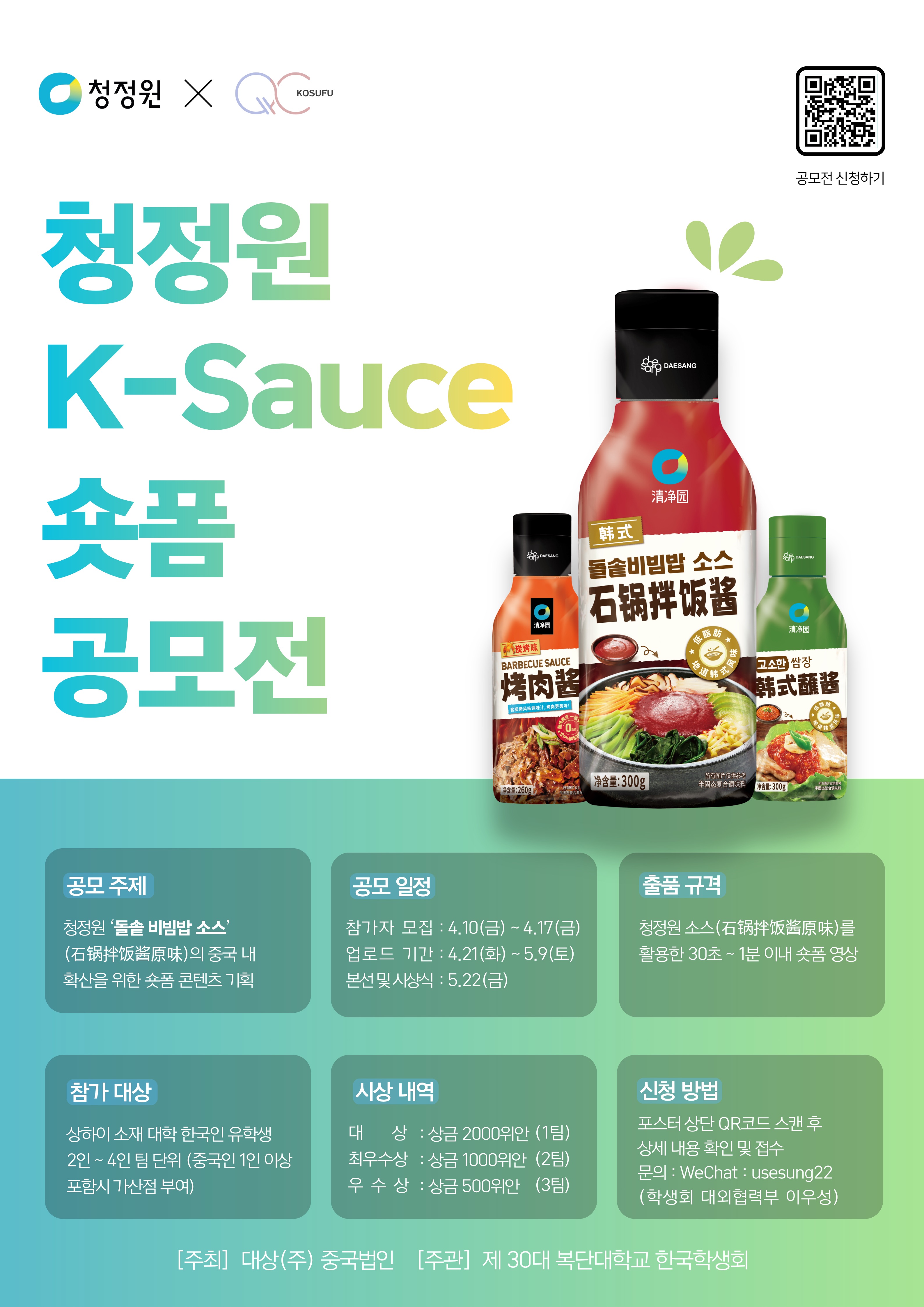 📢 청정원 X 복단대학교 제 30대 한국학생회 (KOSUFU) 숏폼 공모전 개최 안내 안녕하세요, KOSUFU입니다. 청정원과 KOSUFU가 함께하는 "청정원 K-Sauce 숏폼 공모전"이 개최됩니다🙌 💡공모 주제 청정원 ‘돌솥 비빔밥 소스(石锅拌饭酱原味)’의 중국 내 확산을 위한 숏폼 콘텐츠 기획 📍공모 일정 참가자 모집: 4.10(금)~4.17(금) 업로드 기간: 4.21(화)~5.9(토) 본선 및 시상식: 5.22(금) 📹출품 규격 청정원 소스(石锅拌饭酱原味)를 활용한 30초~1분 이내 숏폼 영상 👥참가 대상 상하이 소재 대학 한국인 유학생 2인~4인 팀 단위 (중국인 1인 이상 포함시 가산점 부여) 🏆시상 내역 대상: 상금 2000위안 (1팀) 최우수상: 상금 1000위안 (2팀) 우수상: 상금 500위안 (3팀) 📌신청 방법 포스터 상단 QR코드 스캔 후 상세 내용 확인 및 접수 📩문의 WeChat: usesung22 (학생회 대외협력부 이우성) 영상 제작, 마케팅, 콘텐츠 기획에 관심 있는 분들의 많은 관심과 참여 부탁드립니다✨️